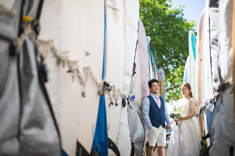 高級ブランド店やサーフボードなどが立ち並ぶハワイのメインタウン。人が行き交う交差点の中、2人だけを切り取ることのできるロケーション